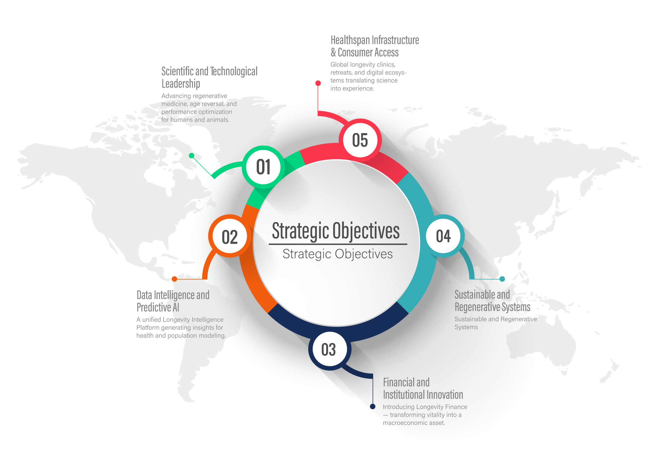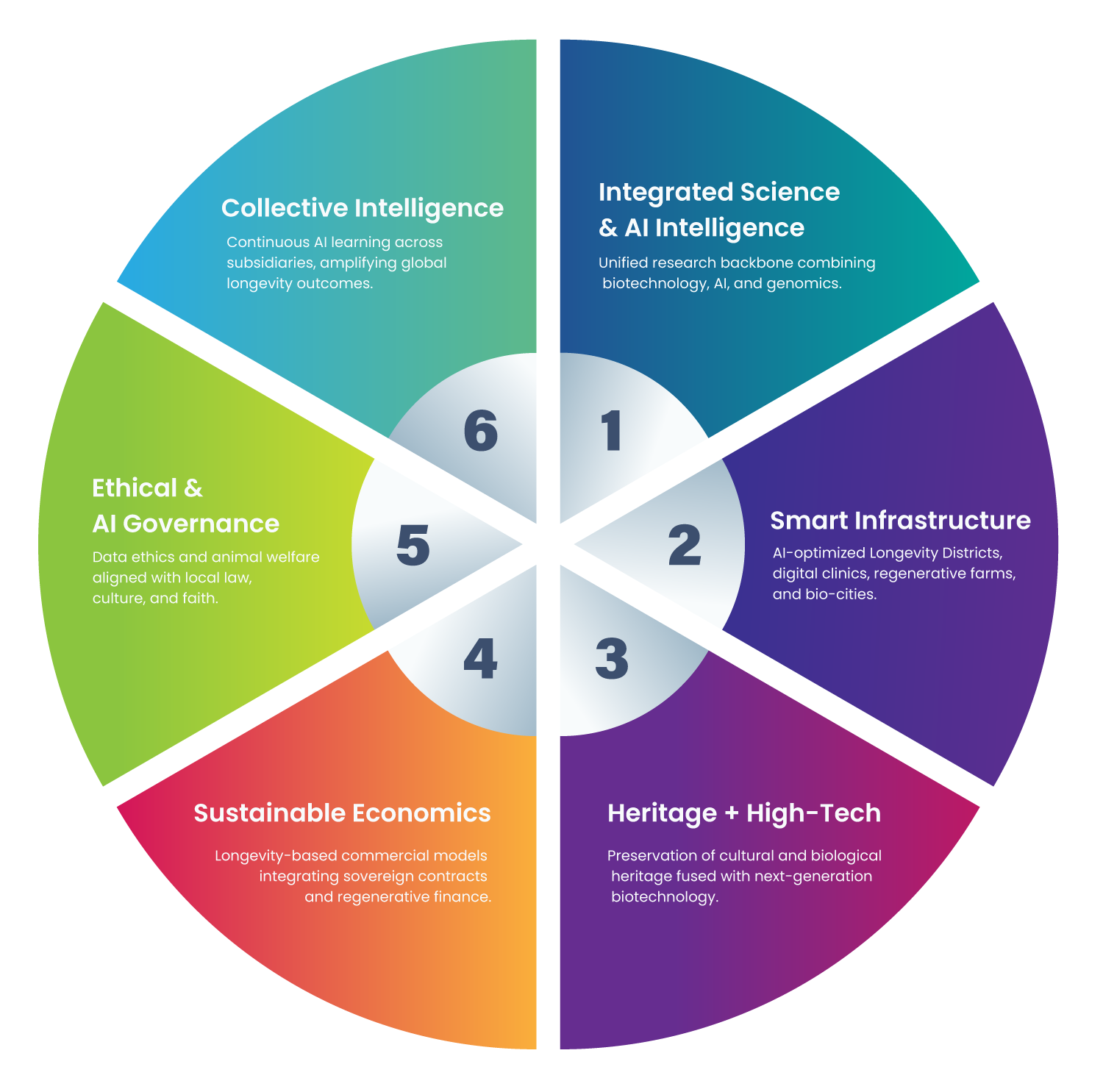 Longevity Group already operates across multiple domains — from scientific & biological advancement, AI-driven data intelligence, and financial resilience, to planetary sustainability.